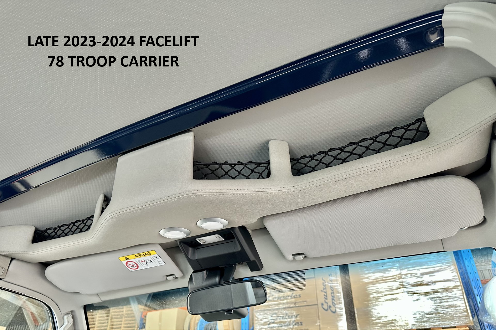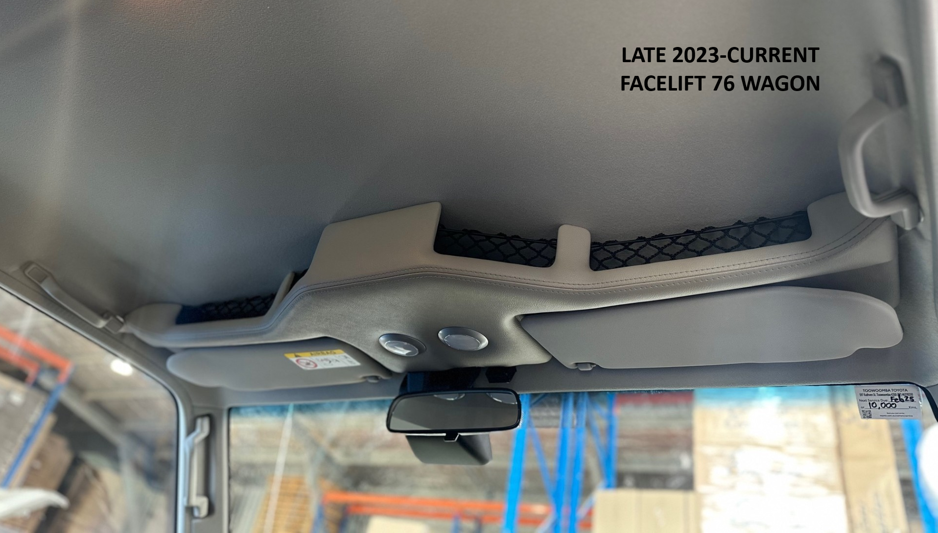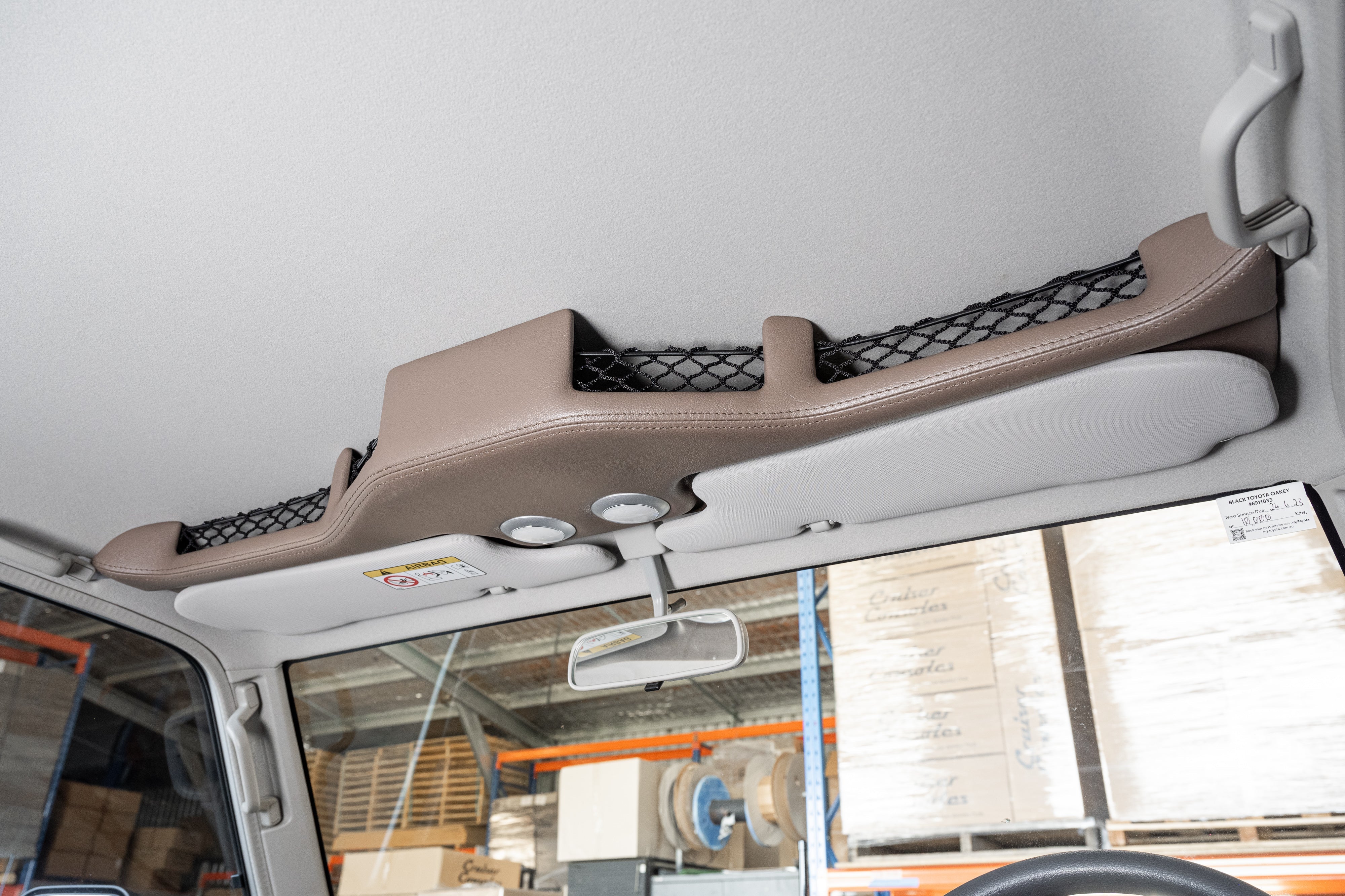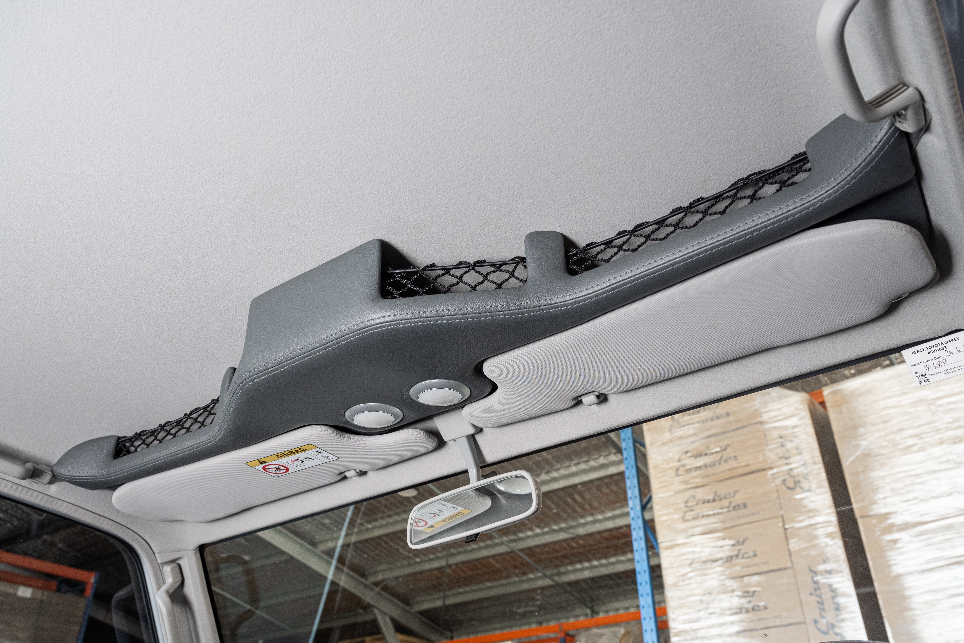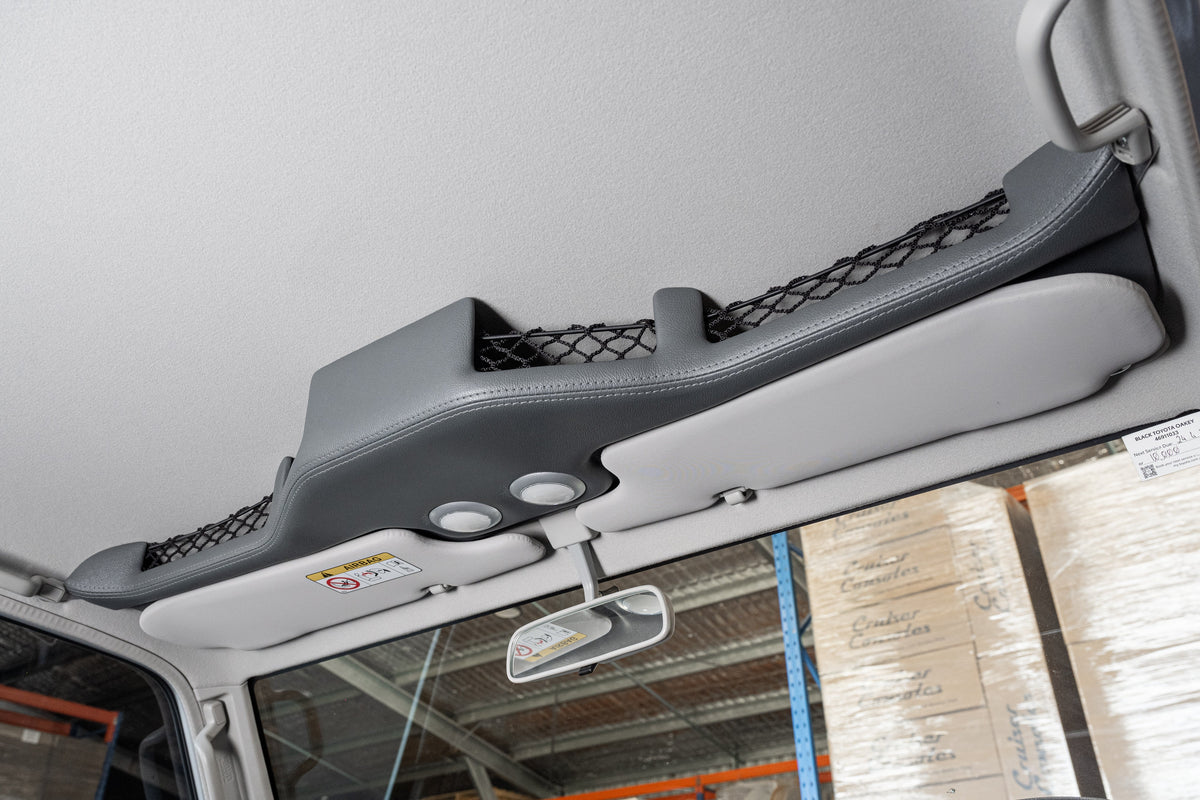 Includes: Pair of front LED touch lights, 4x netted and carpet lined storage pockets, Recesses for the sun visors to sit flush