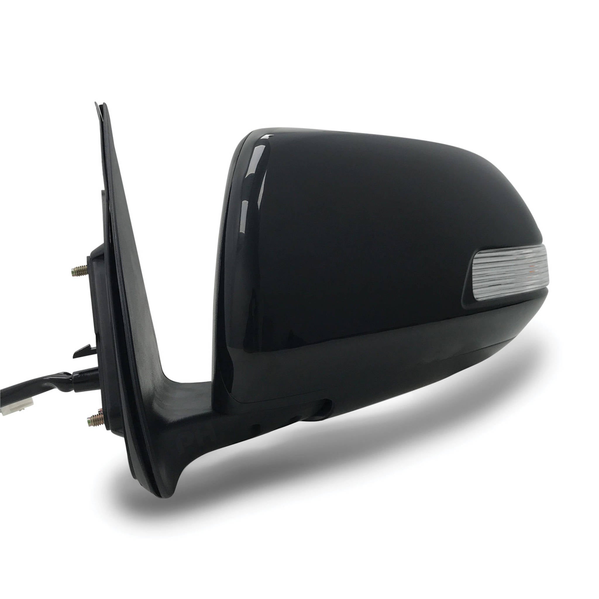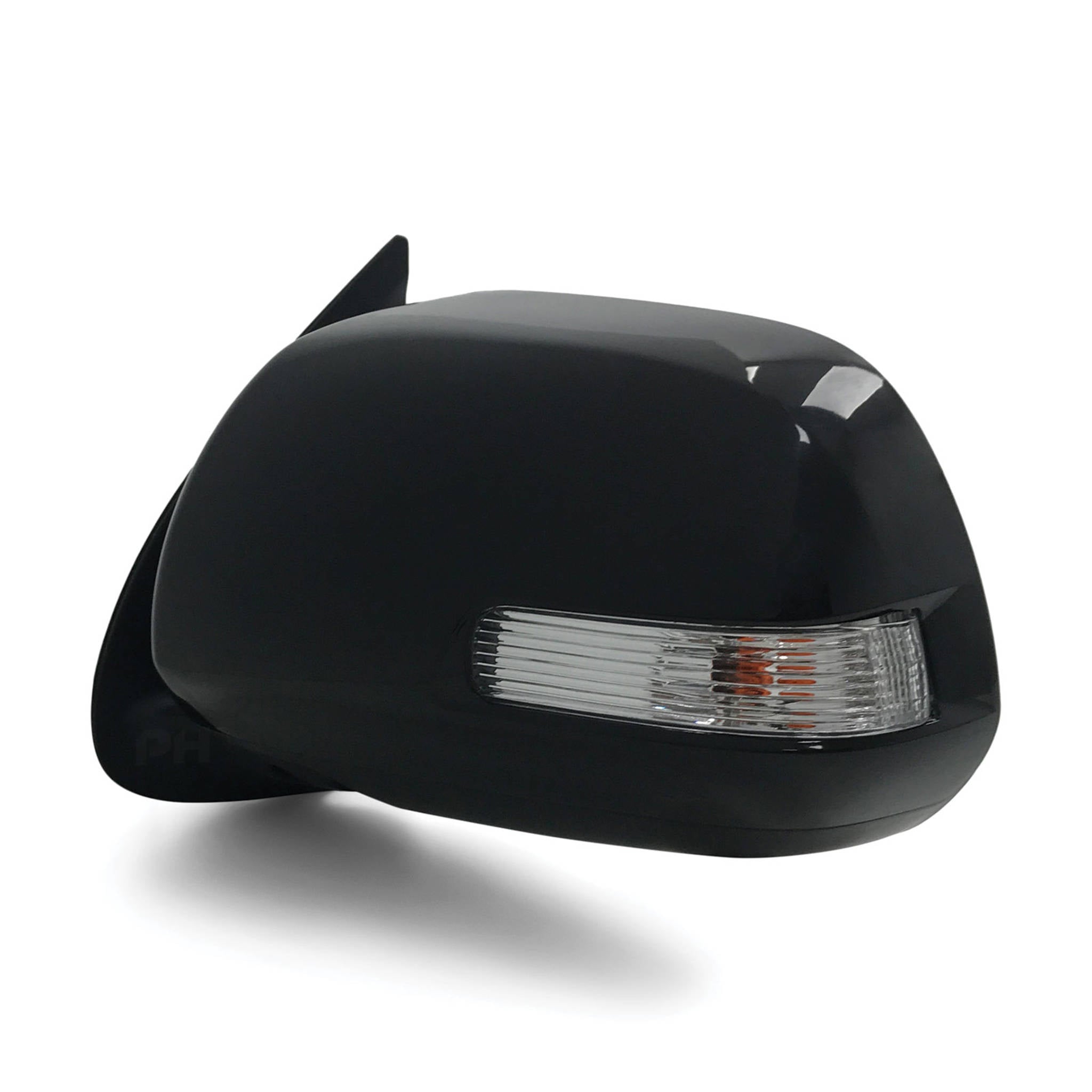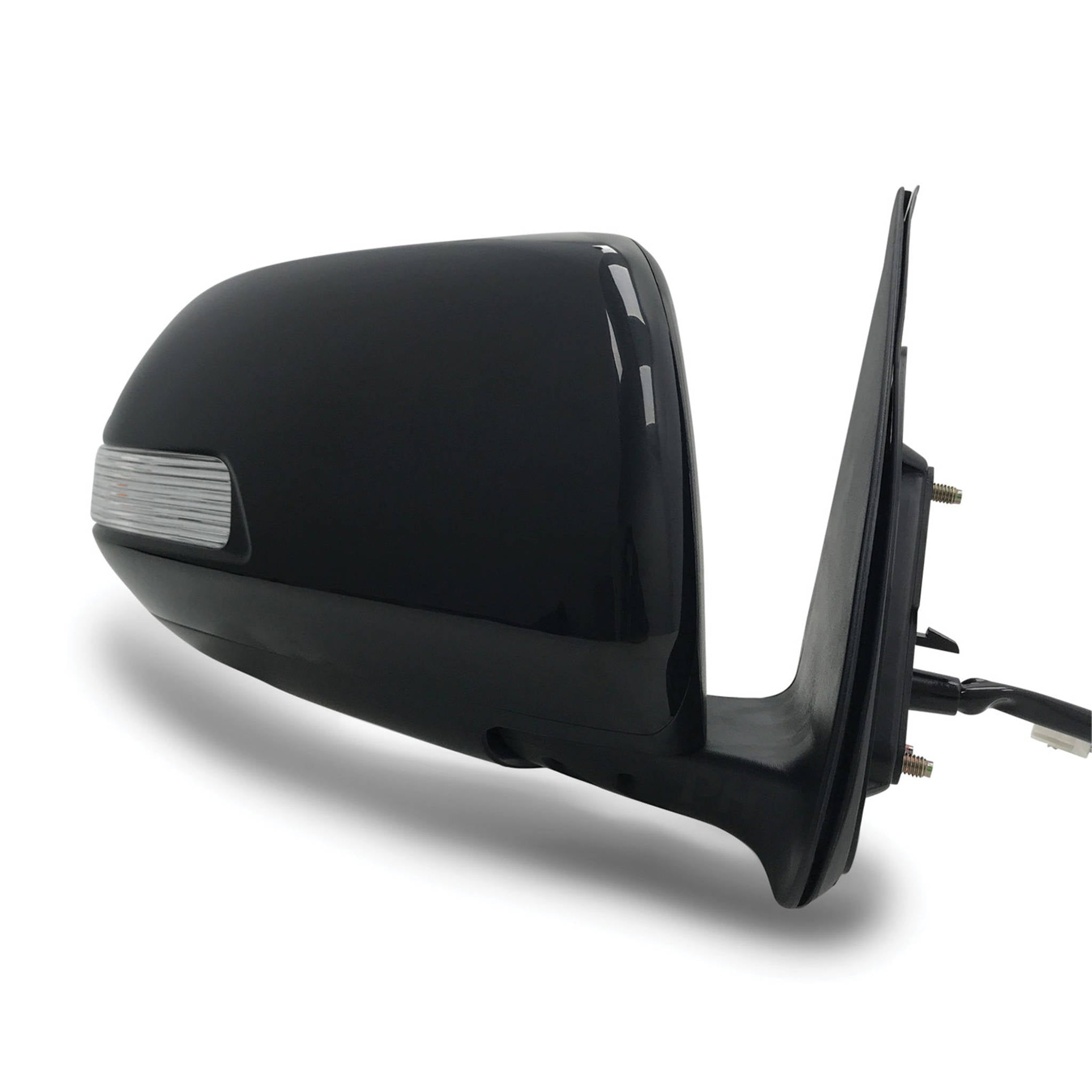 Direct bolt on replacement mirror assembly including a brand new unpainted black plastic mirror cover and indicator light as pictured