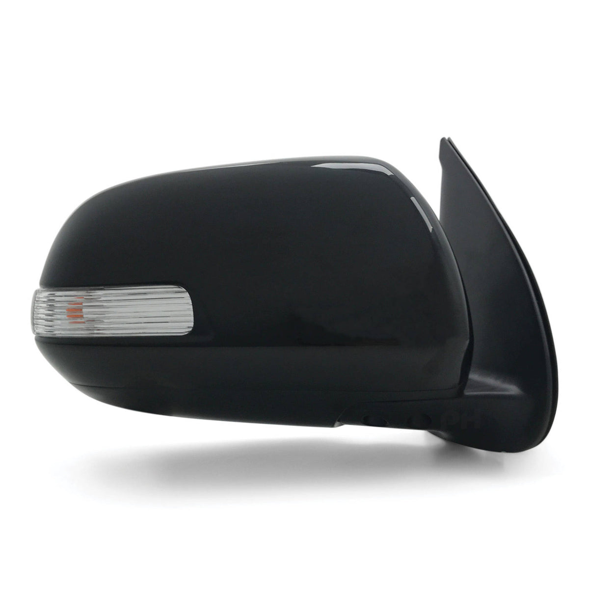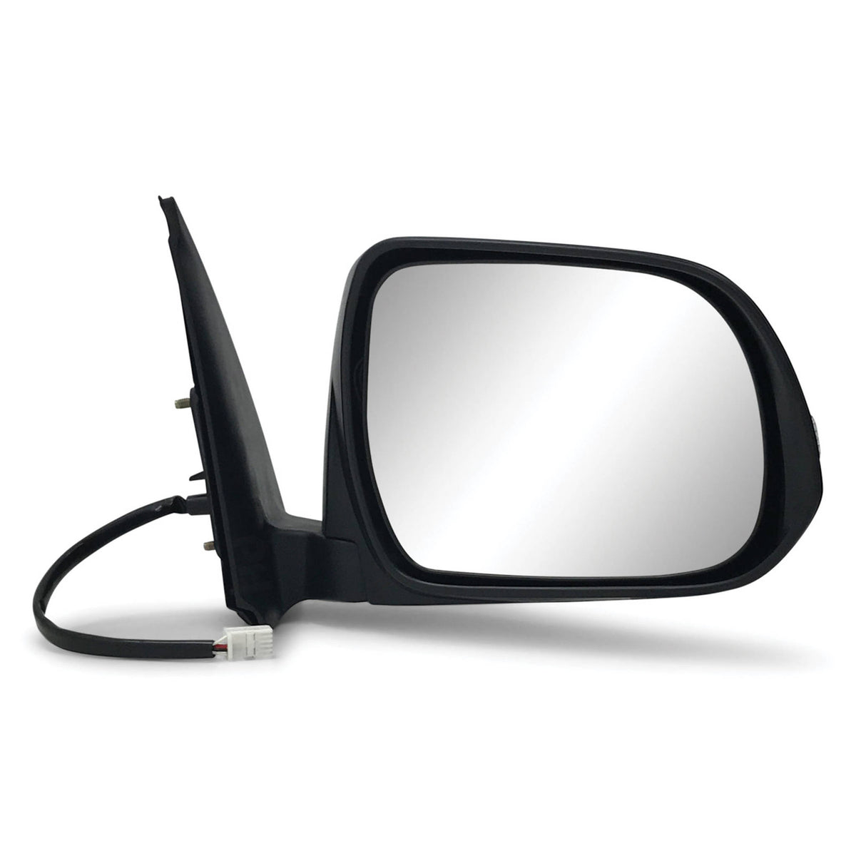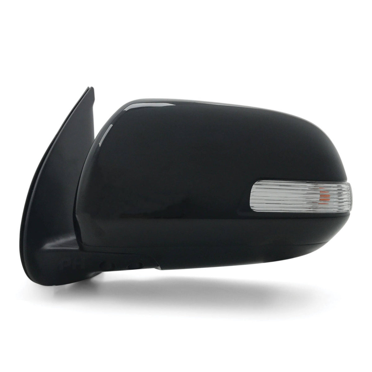 Direct bolt on replacement mirror assembly including a brand new unpainted black plastic mirror cover and indicator light as pictured
