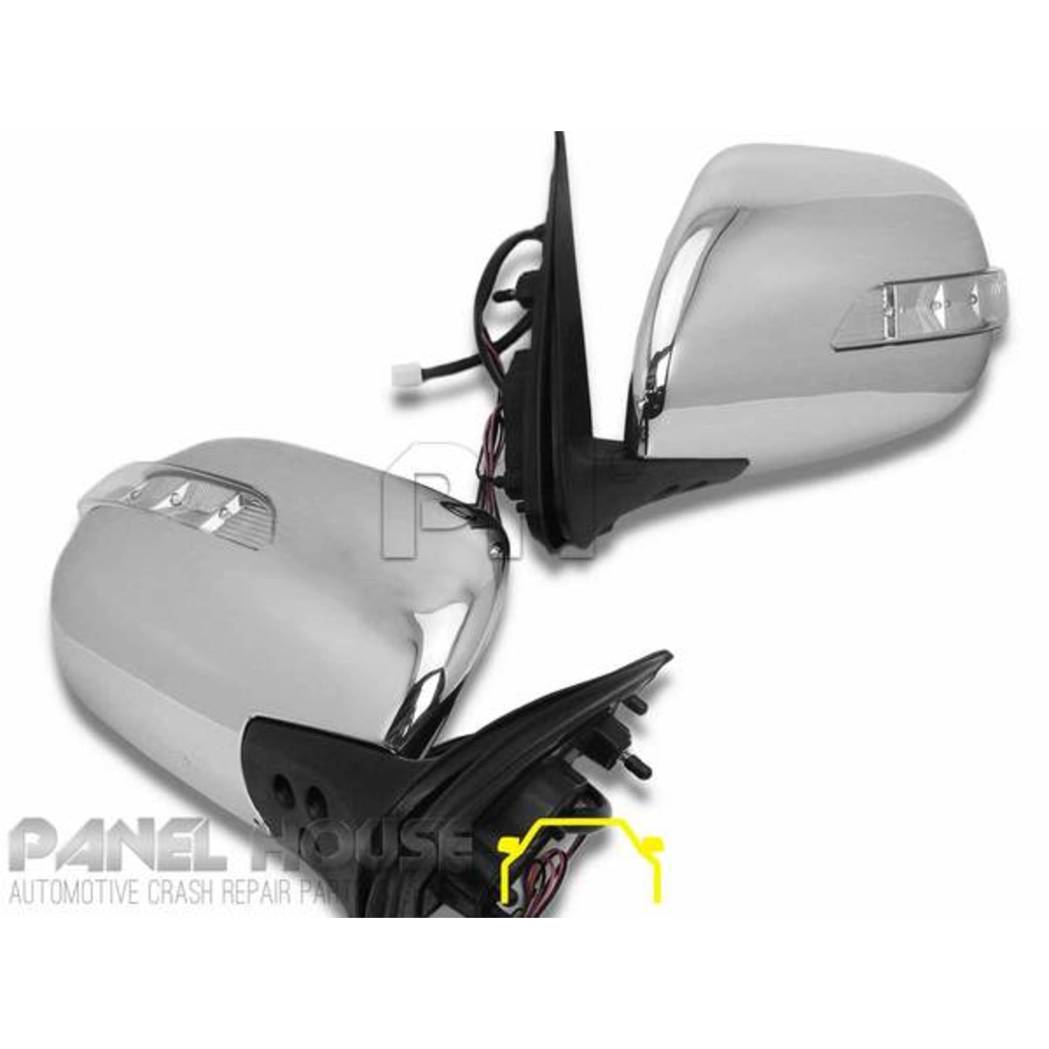 Pair (1x Left and 1x Right side) upgrade mirrors Compatible with both low roof (LWB) and commuter (SLWB) models from 2005 Onwards Brand new non genuine direct replacement mirrors, Designed with a chromed plastic outer cover and black plastic base and clear lens LED indicator blinker lamp as pictured ** INDICATORS WILL NEED TO BE WIRED IN TO FUNCTION AS THE WIRING IS NOT PART OF THE FACTORY HARNESS** To suit models only built between specified dates shown above, please check yours to ensure fitment. If you are unsure whether these are suitable for your model please contact one of our sales staff for assistance VERY popular for replacing the factory released black electric mirrors WITHOUT indicator lights built in. Premium aftermarket replacement mirrors with the quality of OEM (genuine) mirrors giving you a cheaper replacement option .