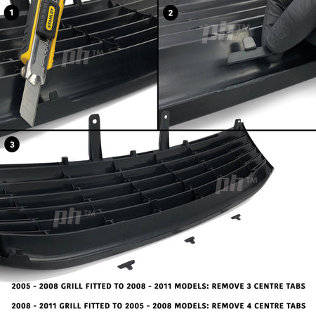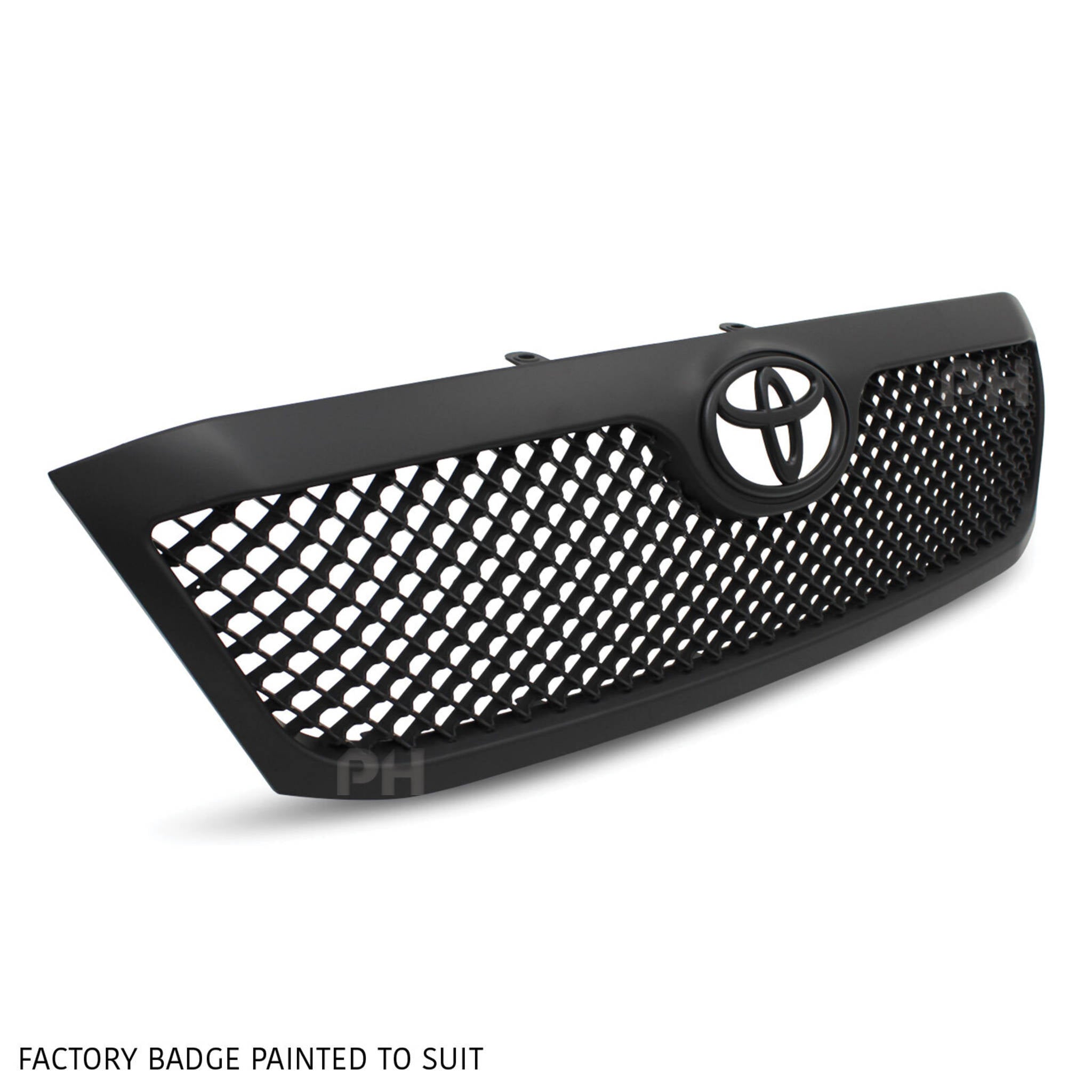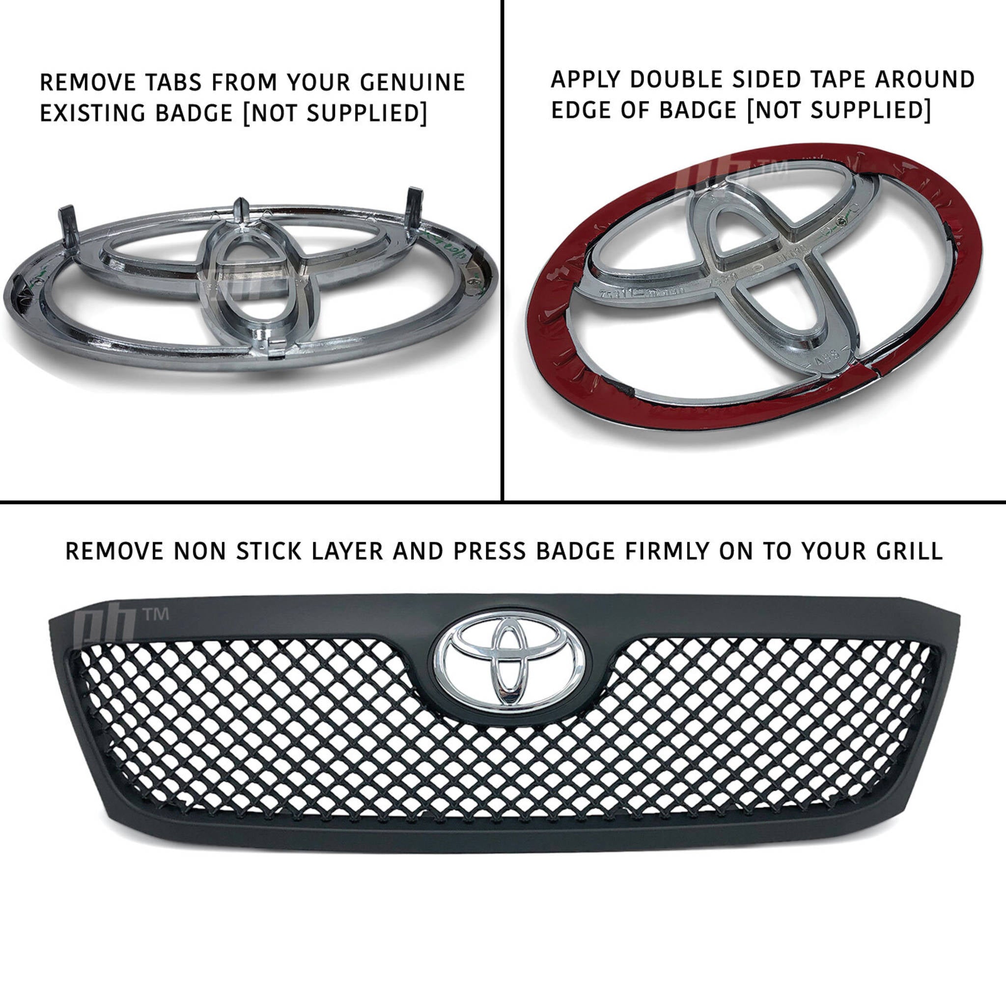Badge fitment - Remove tabs from existing genuine toyota badge then apply double sided tape around edge and lastly stick on to your new grill