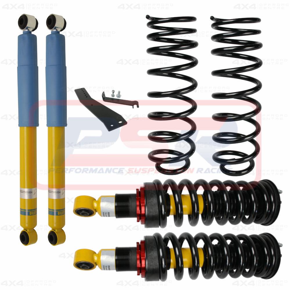 This kit contains Bilstein front struts all pre-assembled with Kings coil springs and HD strut tops, King Springs 2" rear coils, Bilstein rear shocks and headlight aim bracket.
