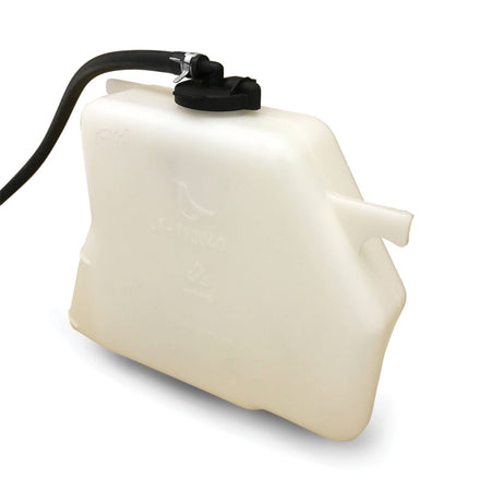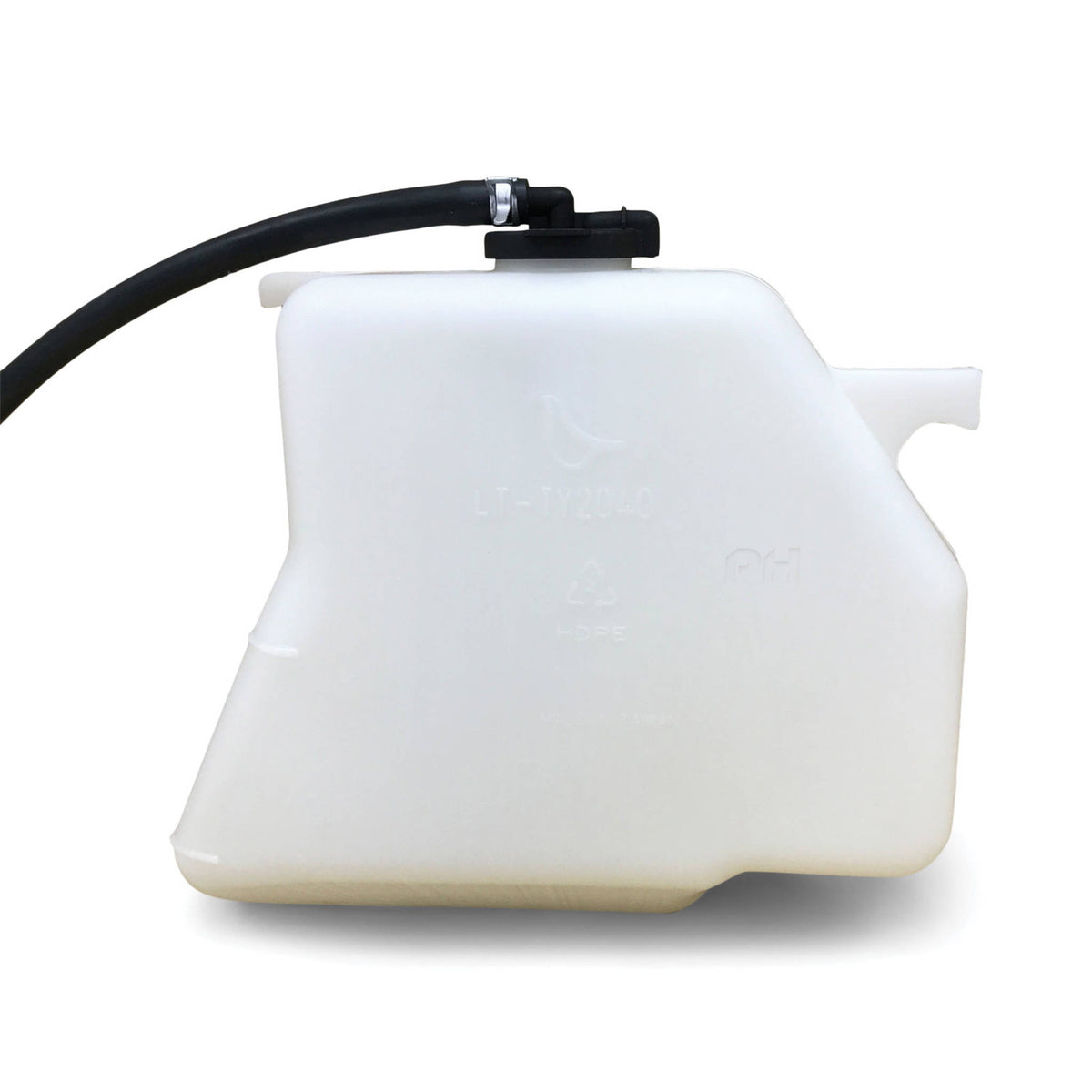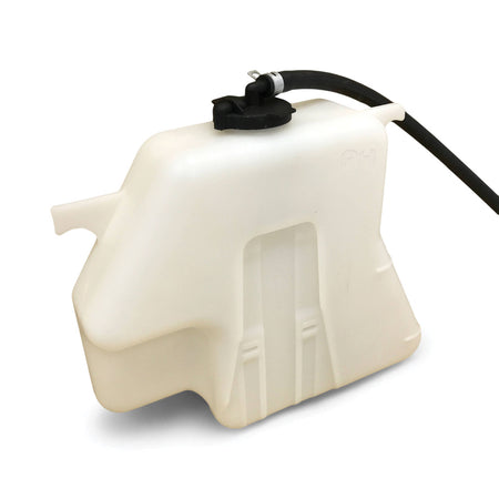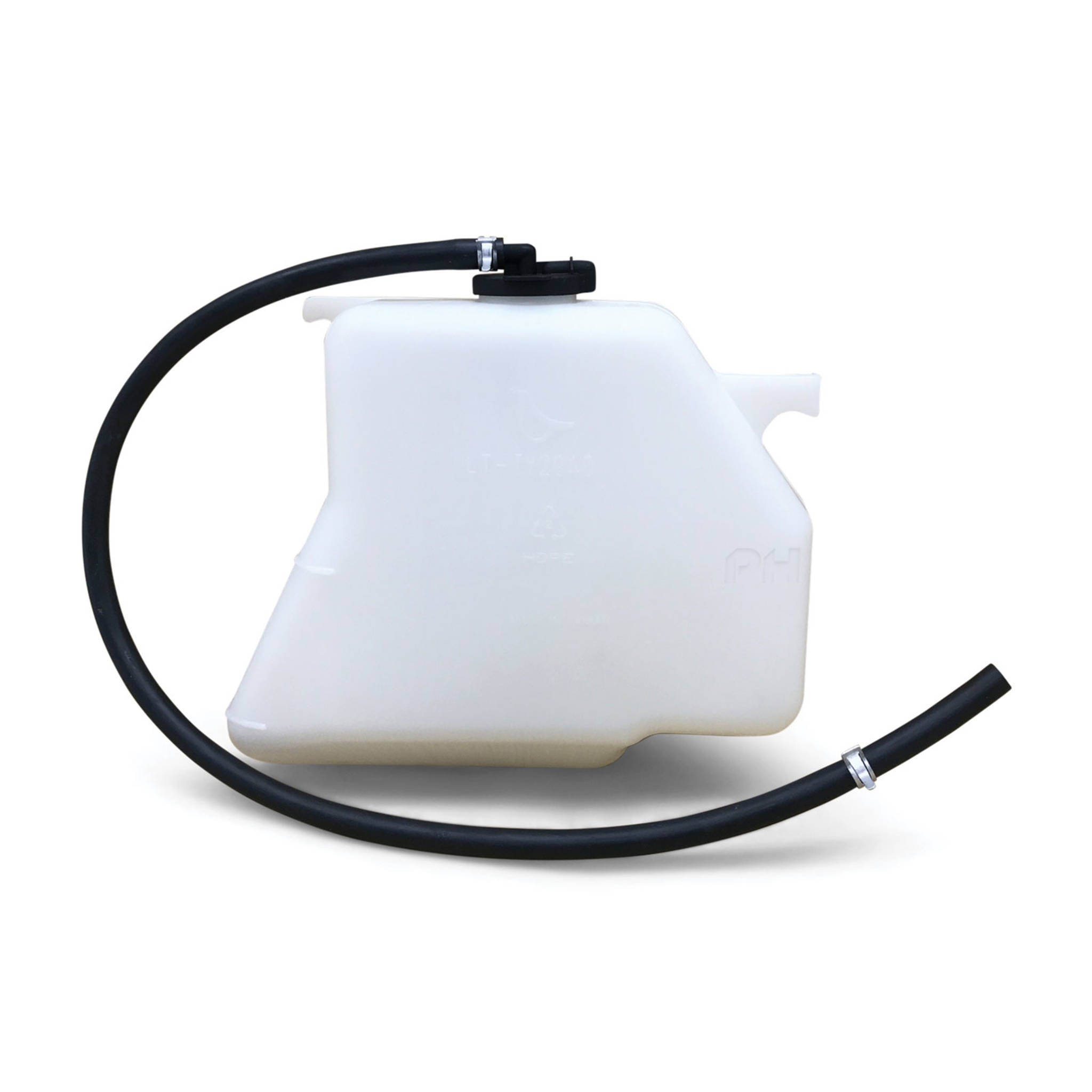 Radiator overflow bottle is a white plastic bottle, comes with the cap and hose.