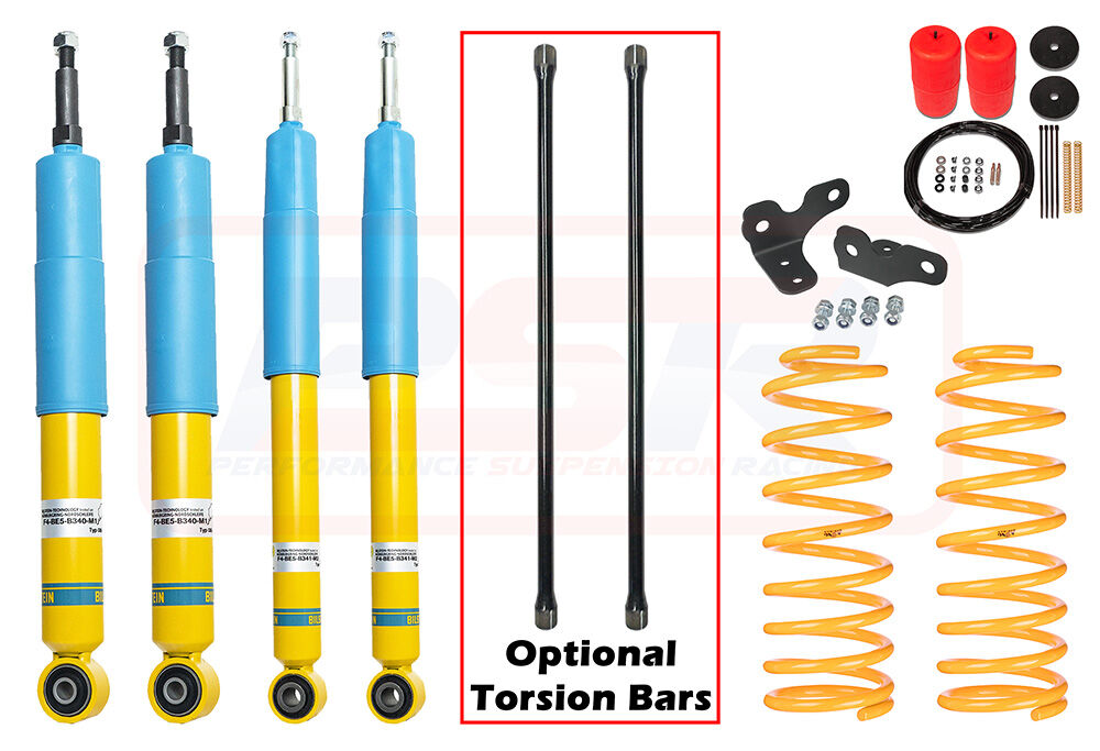 This kit contains Bilstein front and rear shocks with King Springs rear coils, Polyair airbag kit and optional torsion bars with strengthening bracket kit.